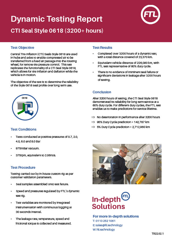 FTL tested a CTI Seal Style 0618 in their Centre of Excellence, to determine the reliability of this seal profile over long term use – in this case a period of over 3200 hours. The full test procedure, detailed results and conclusions are available for download below.