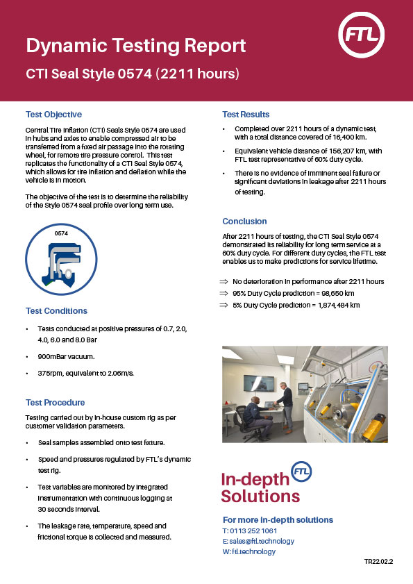 FTL tested a CTI Seal Style 0574 in their Centre of Excellence, to determine the reliability of this seal profile over long term use – in this case a period of 2211 hours. The full test procedure, detailed results and conclusions are available for download below.
